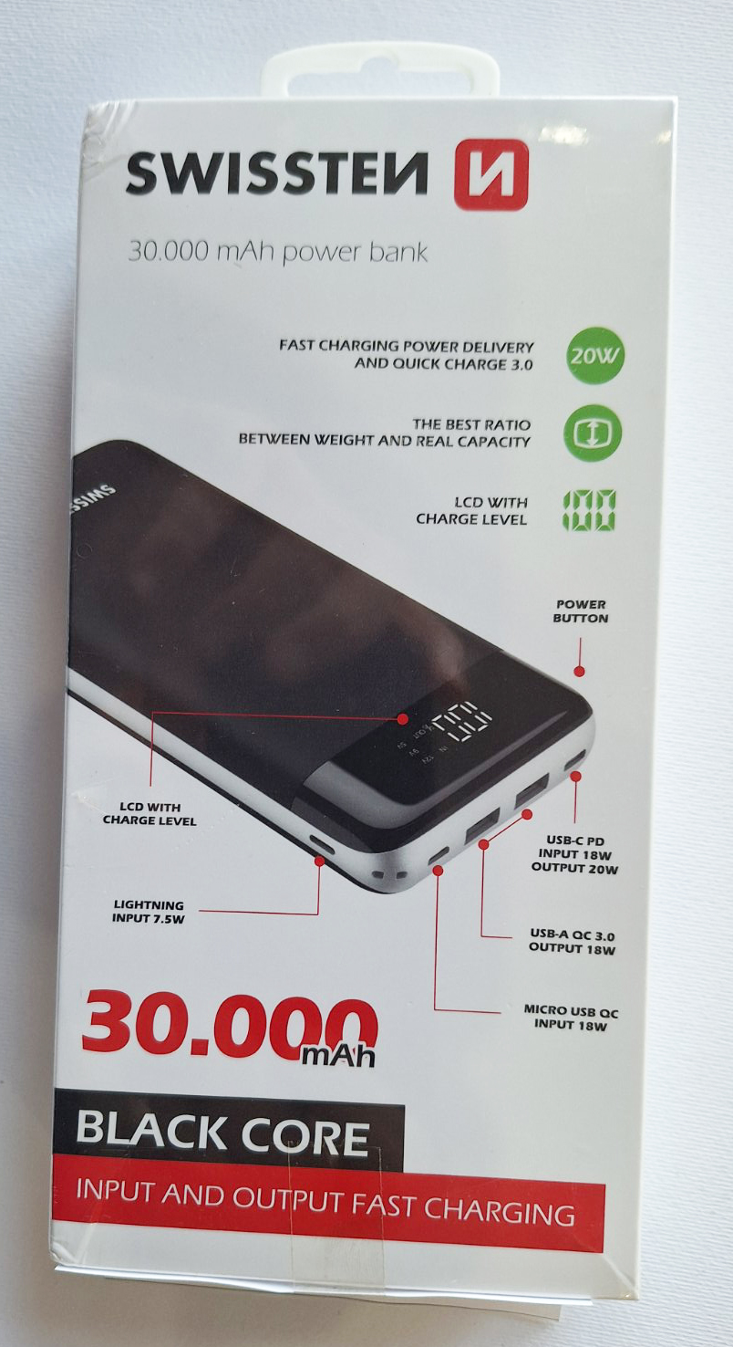 Title: Powerbank 30000MAH Swissten black SKU: 015270 Model: Brend: NNBaterije i punjačiPrice: 65,00 €52,00 € boja Quantity Stock: 1.00